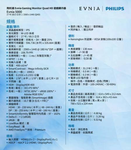 PHILIPS 飛利浦 27M2N5500 HDR電競螢幕(27型/2K/180Hz/1ms/IPS)